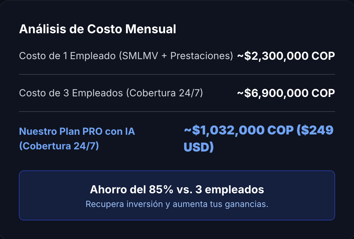 No es magia, es matemática. Un equipo de IA que cubre 3 turnos (24 horas) te cuesta menos de la mitad que un solo empleado de 8 horas. La eficiencia tiene un nuevo estándar.
